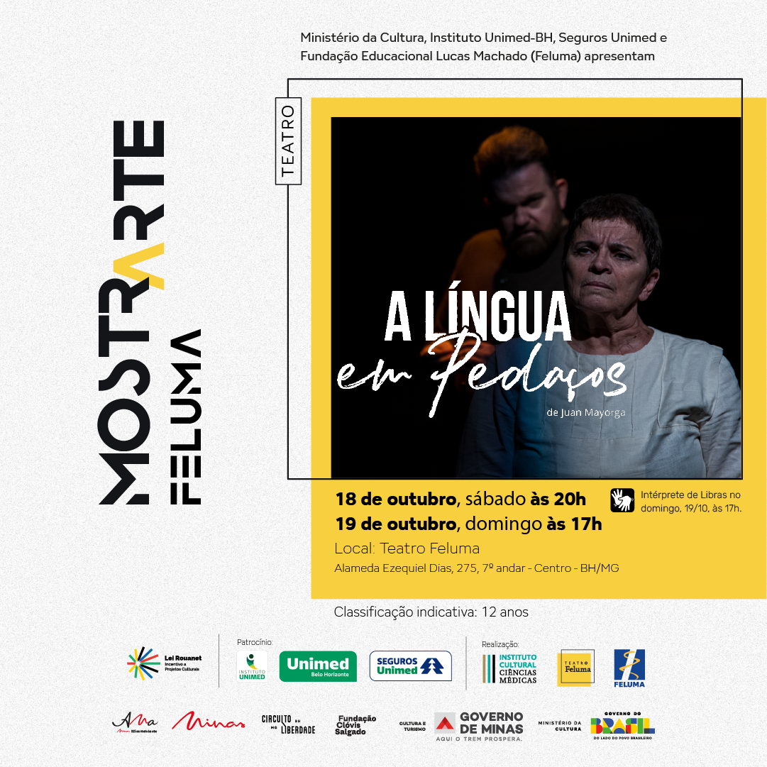 A programação da MostrArte Feluma para o mês de outubro traz ao Teatro Feluma uma atração internacional gratuita! O Ministério da Cultura, o Instituto Unimed-BH, a Seguros Unimed e a Fundação Educacional Lucas Machado (Feluma) apresentam o espetáculo “A Língua em Pedaços”, com texto premiado do escritor espanhol Juan Mayorga, interpretado pelo ator luso-brasileiro Beto Coville e a atriz portuguesa, Luísa Ortigoso.