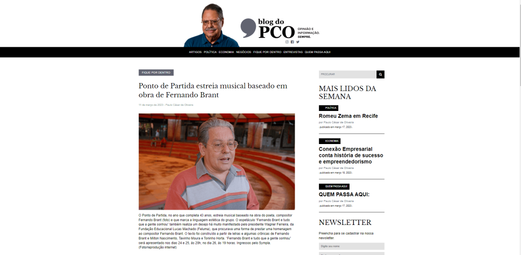 A imprensa mineira repercute o a estreia do espetáculo “Fernando Brant e tudo que a gente sonhou”, do grupo Ponto de Partida, aqui no Teatro Feluma 💛.